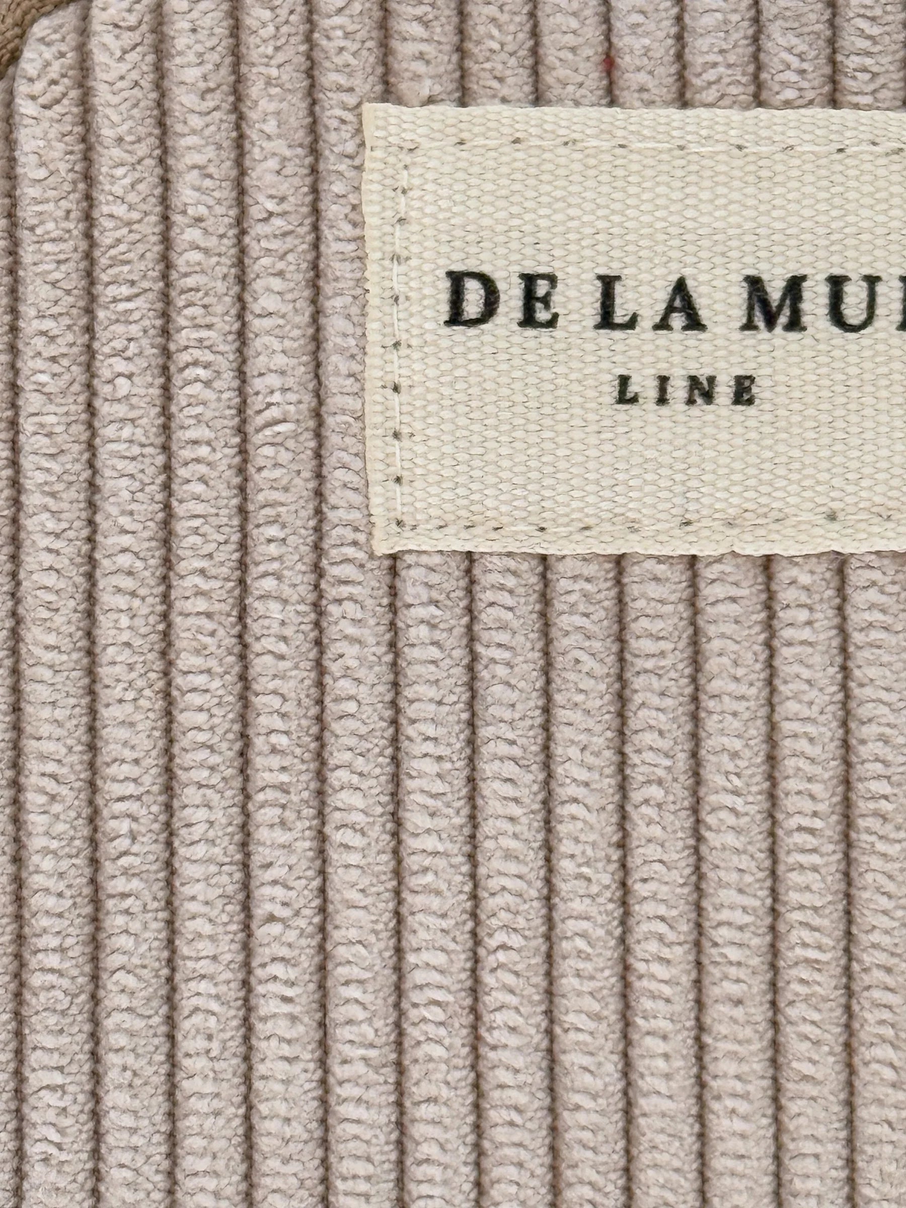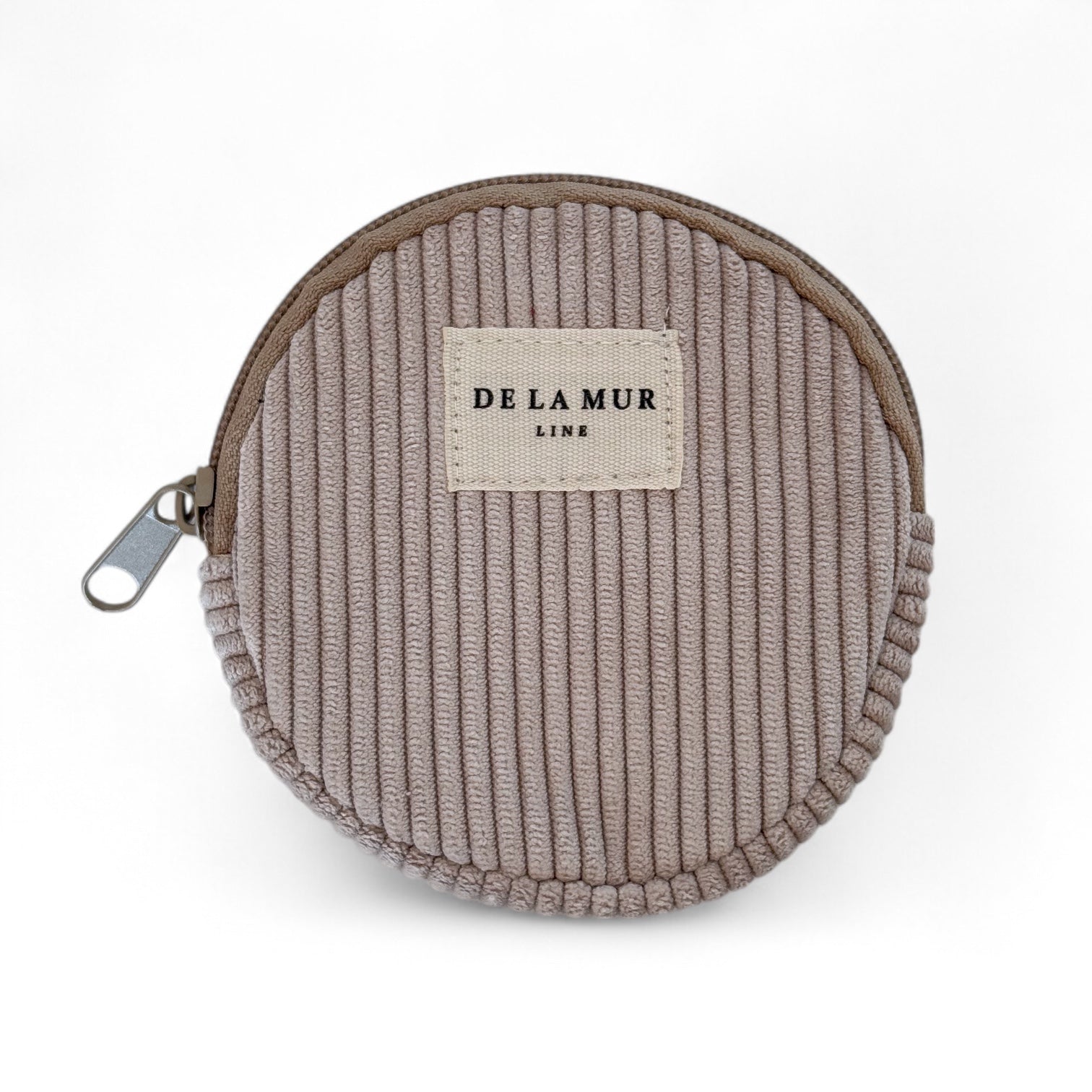 Dit speelse, ronde portemonneetje van de La Mur Line is uitgevoerd in een beige corduroy ribstof.