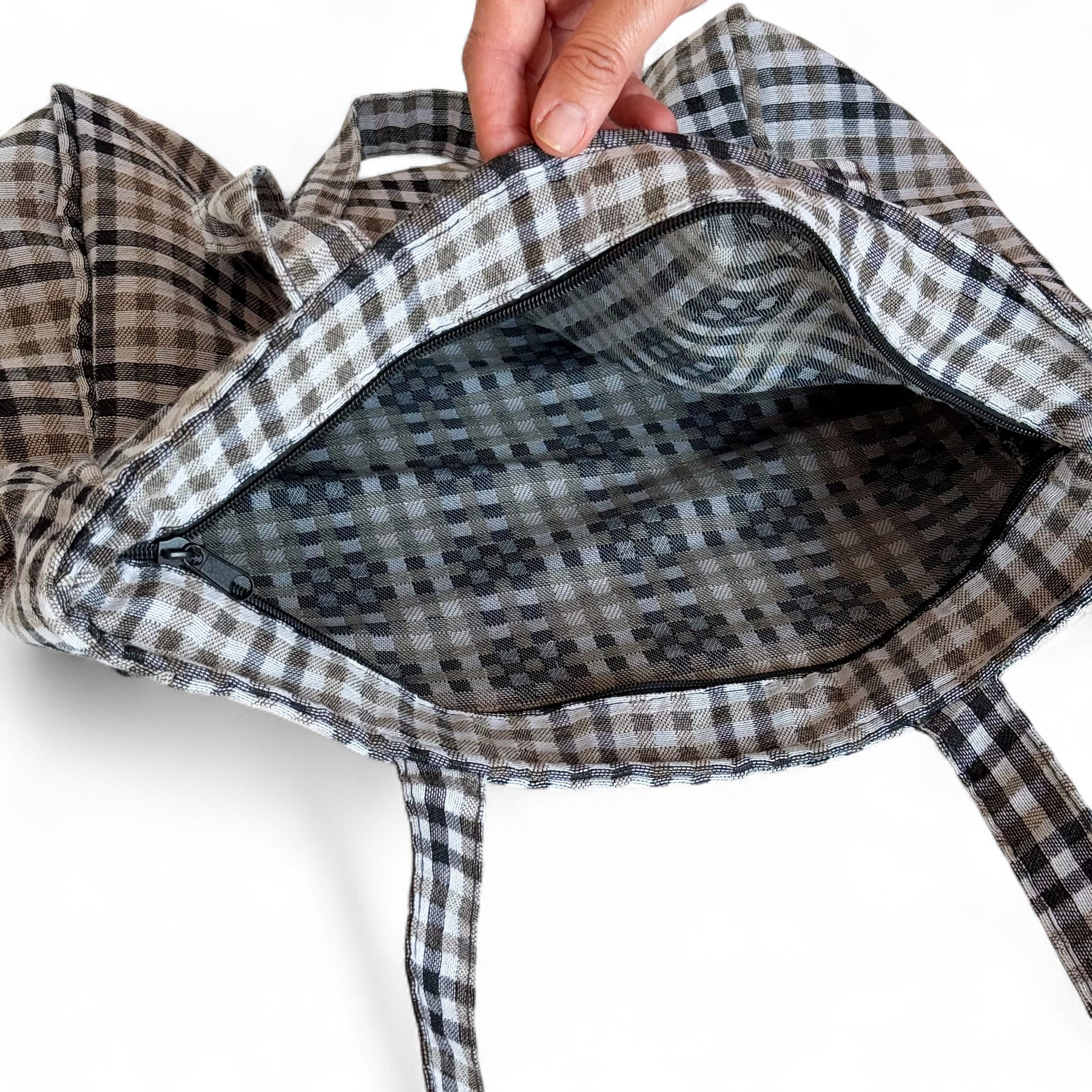 Deze rechthoekige Shopper van De La Mur Line is uitgevoerd in een dikke jacquardstof met een ruitjespatroon in beige en zwarttinten.