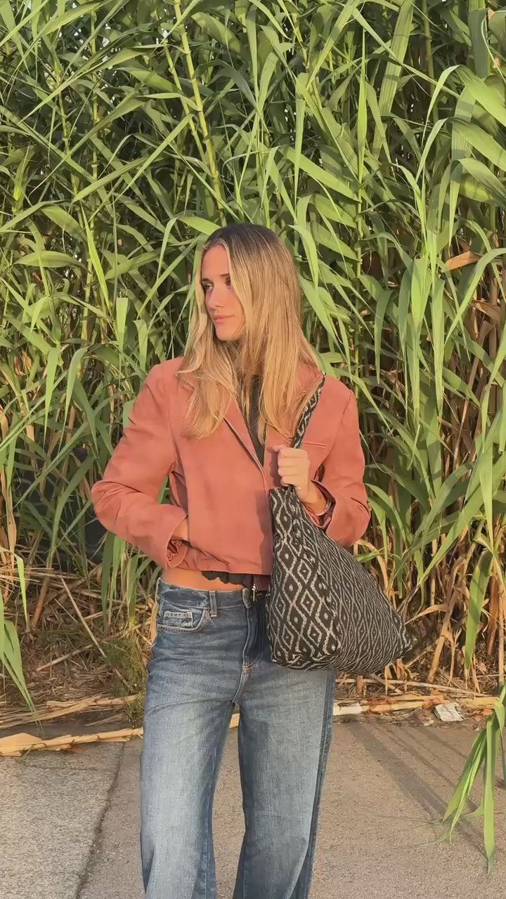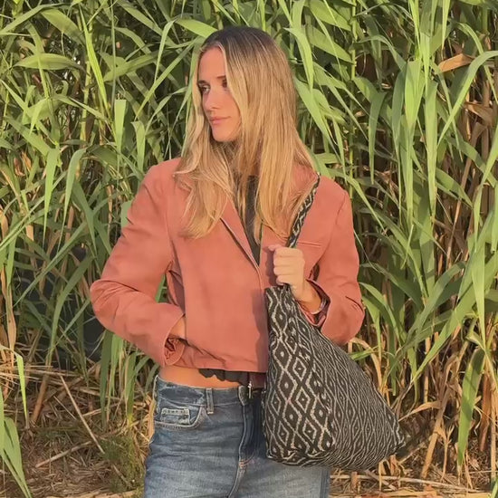 Deze rechthoekige Shopper van De La Mur Line is uitgevoerd in een dikke jacquardstof met een beige, grafisch ruitpatroon op een diepzwarte achtergrond.