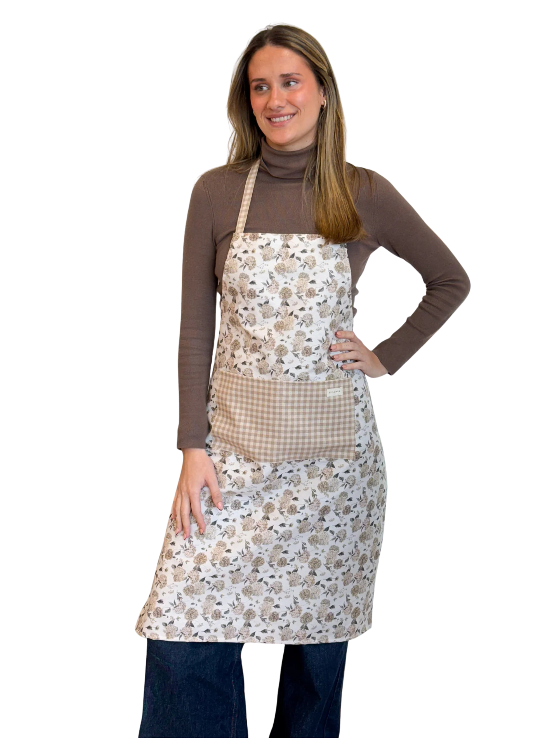 Dit keukenschort van de La Mur Line is gemaakt van een half-panama stof met een beige bloemenprint, gecombineerd met een beige Vichy-ruitjesprint op het voorvak.