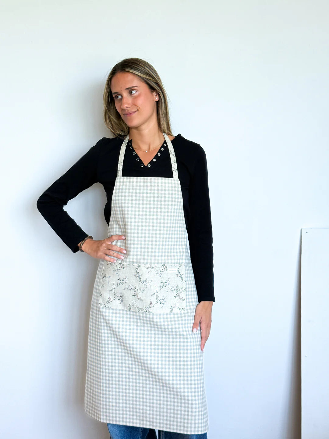 Dit keukenschort van de La Mur Line is gemaakt van een half-panama stof met een pastelgroene Vichy-ruitjesprint, gecombineerd met een bloemenprint op een grijsachtige achtergrond op het voorvak.