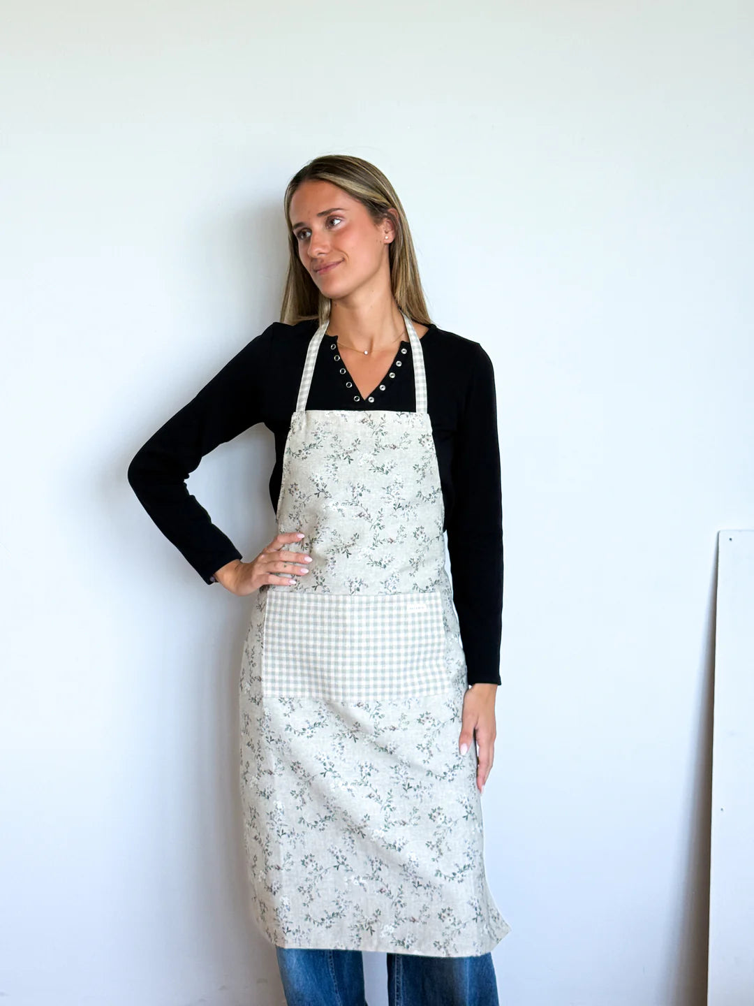 Dit keukenschort van de La Mur Line is gemaakt van een half-panama stof met een bloemenprint op een grijsachtige achtergrond, gecombineerd met een ruitjesprint op het voorvak.