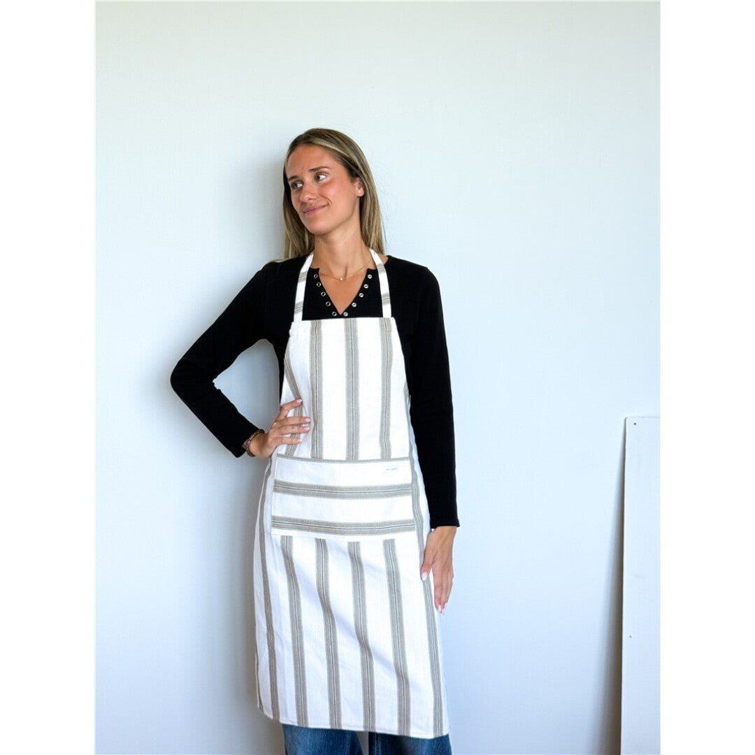 Dit keukenschort van de La Mur Line is gemaakt van een stevige stof met een subtiel gestreept patroon in lichtbruin en wit.