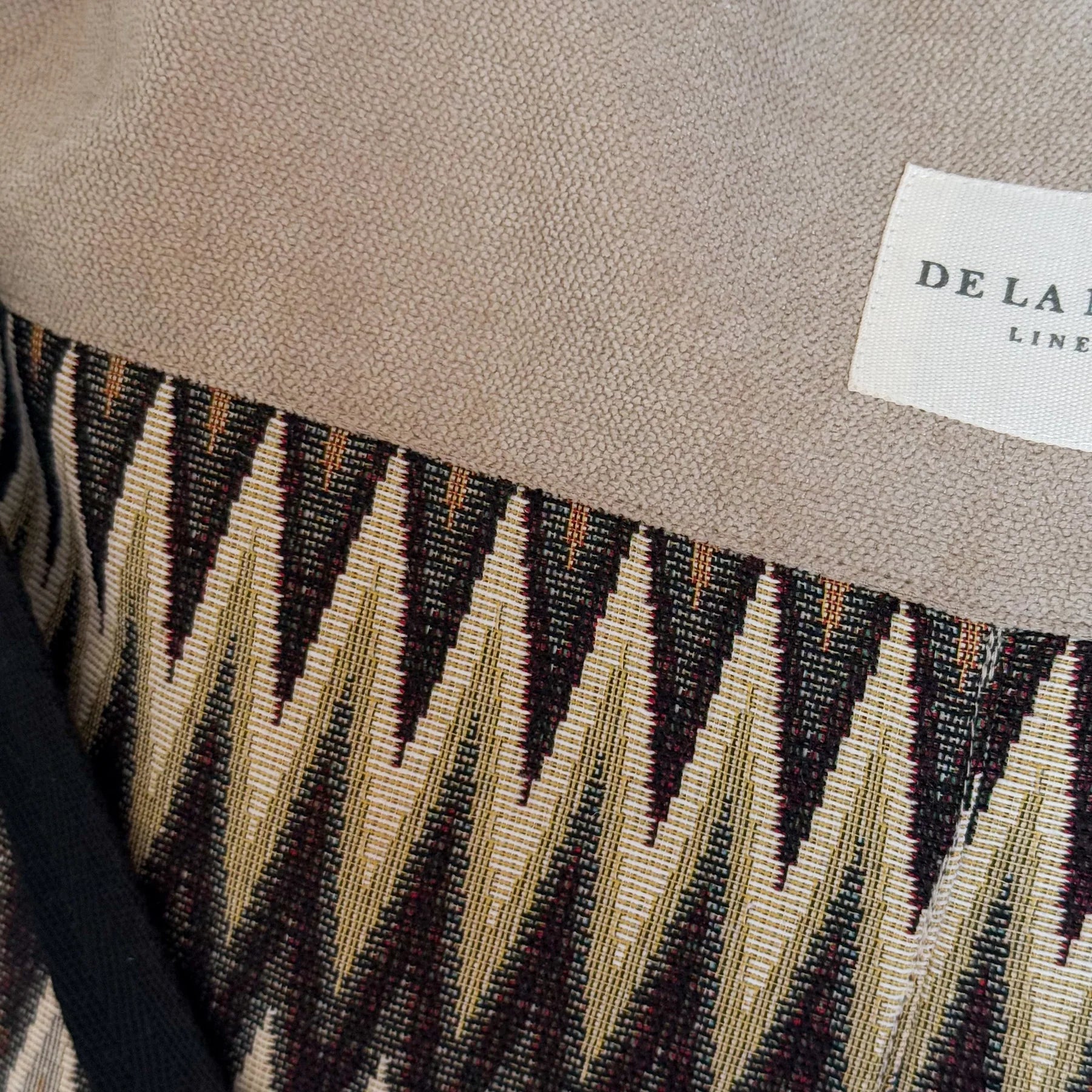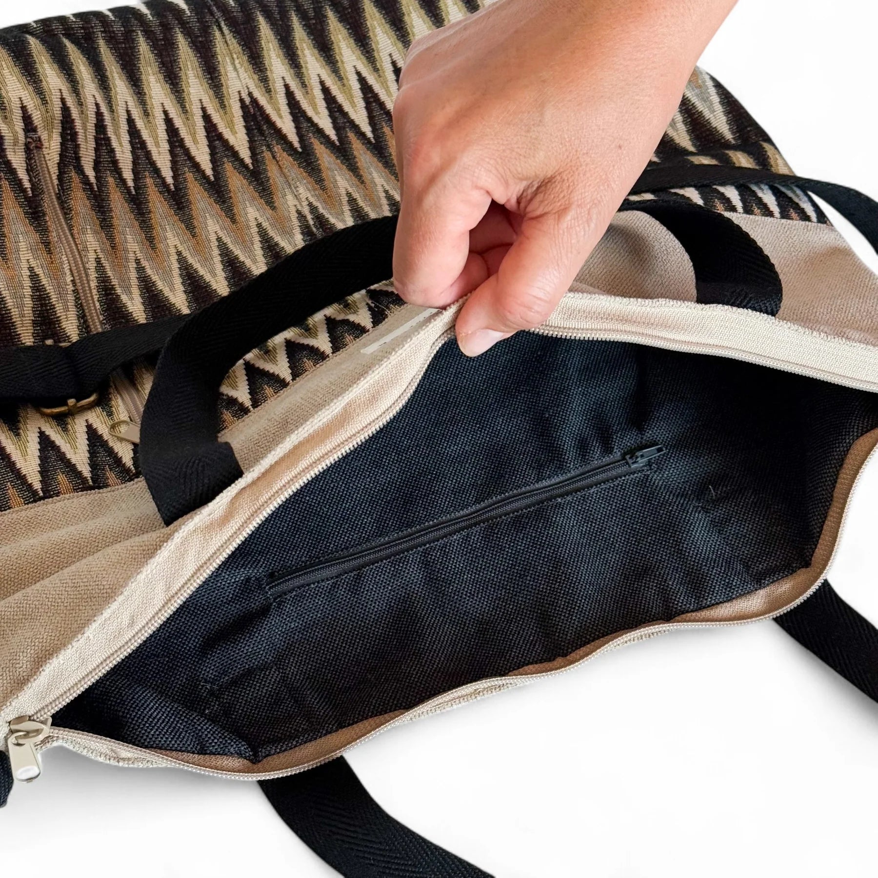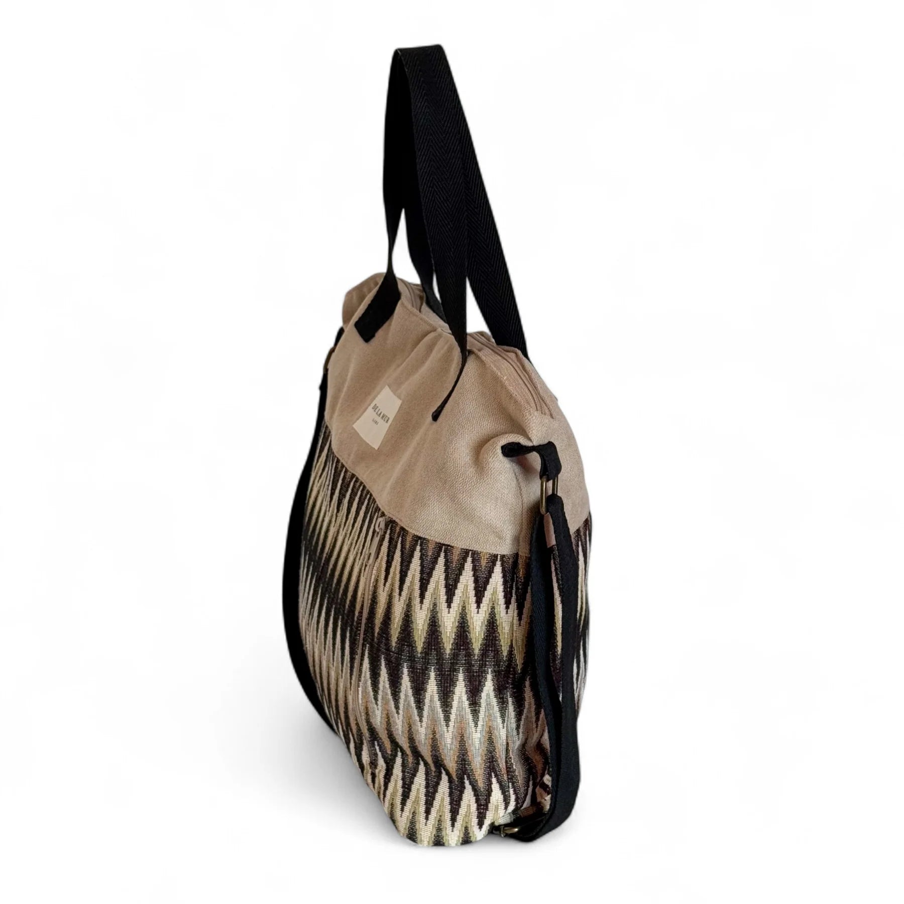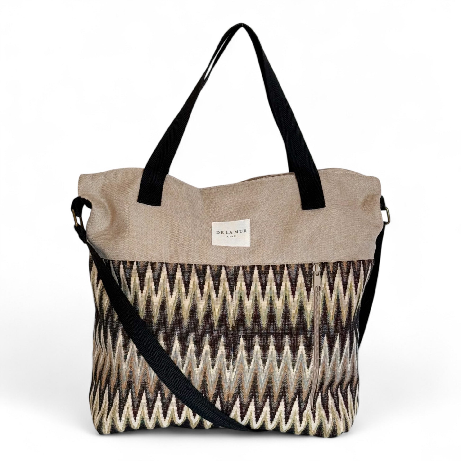 Deze grote schoudertas van de La Mur Line is uitgevoerd in een dikke jacquardstof met een zigzagpatroon in aardse kleuren als beige, bruin, zand en zwart.