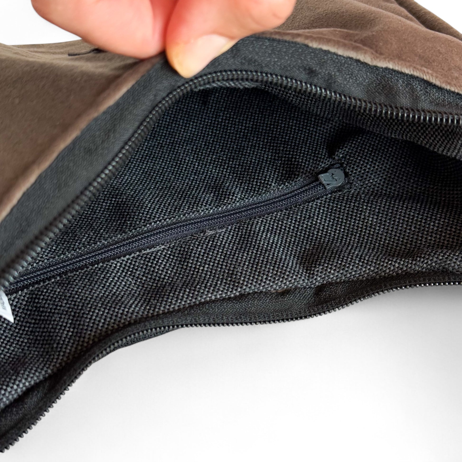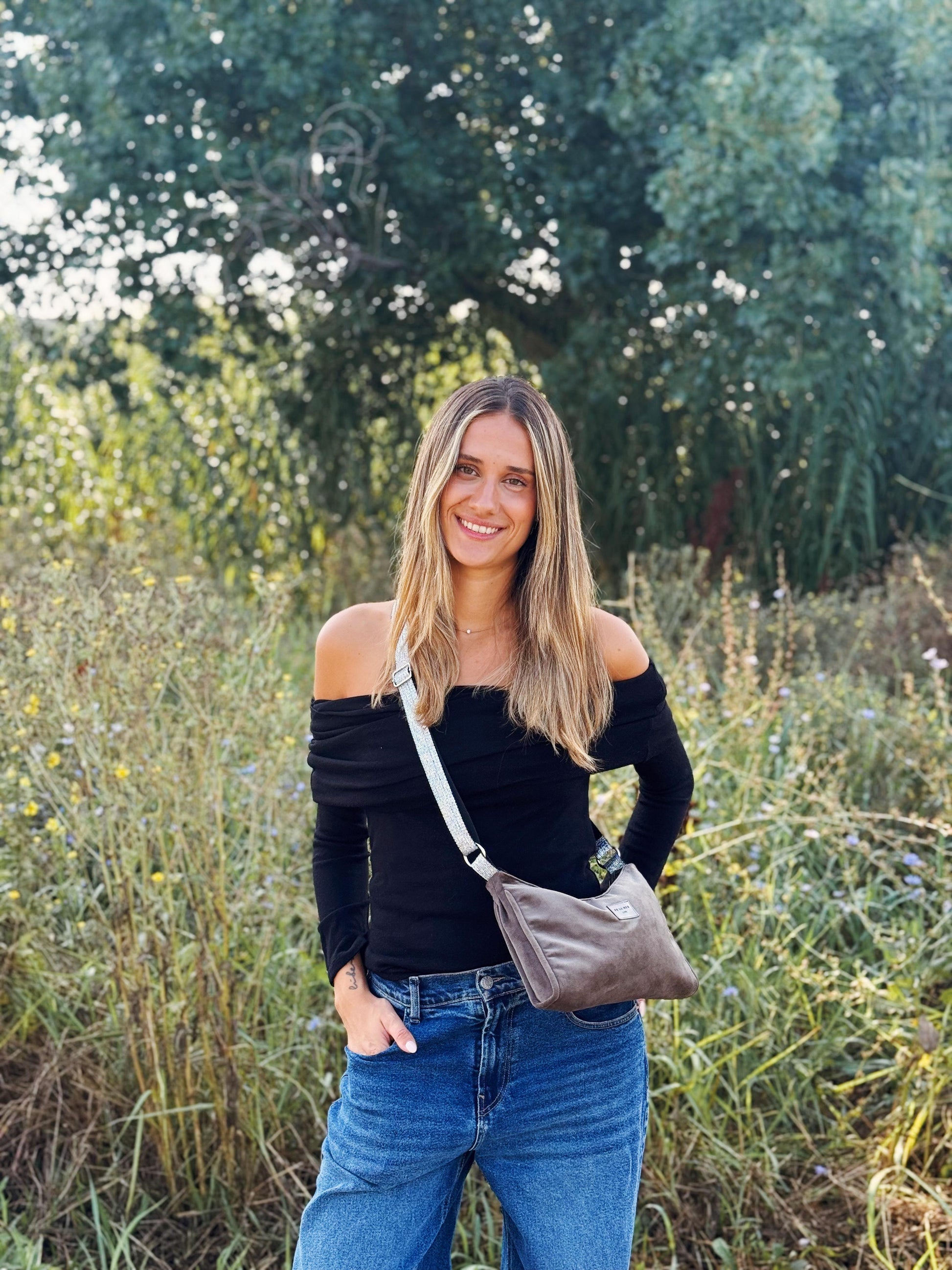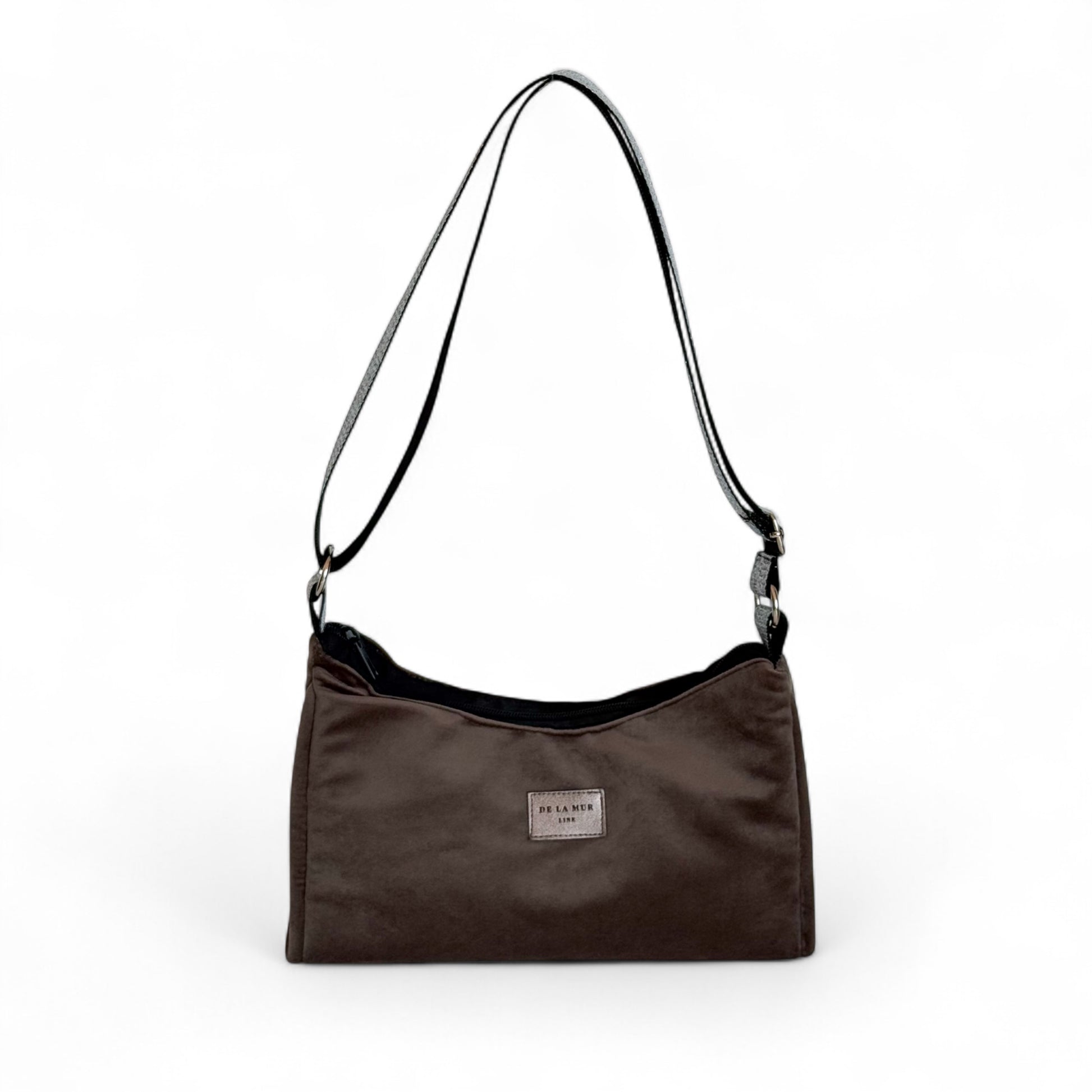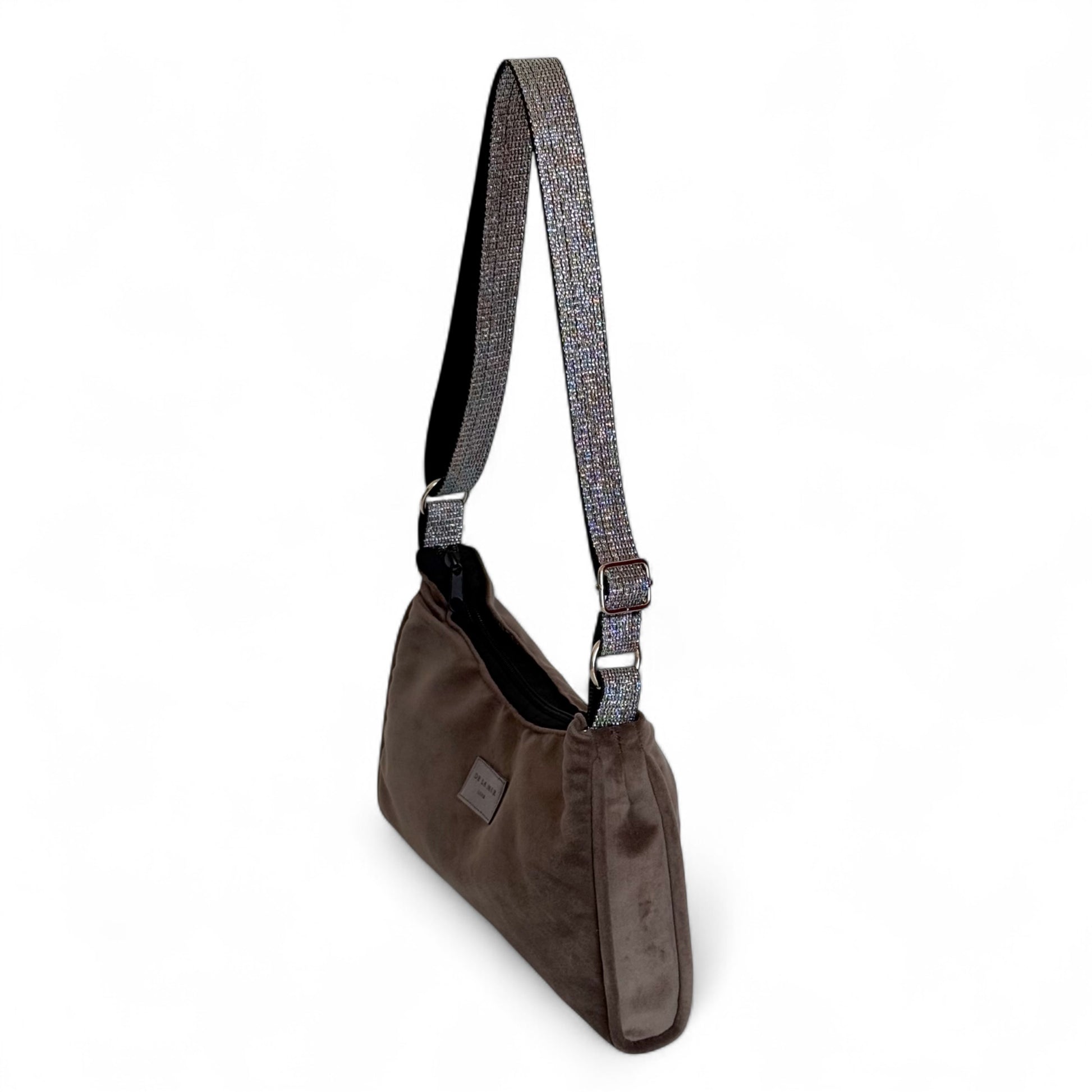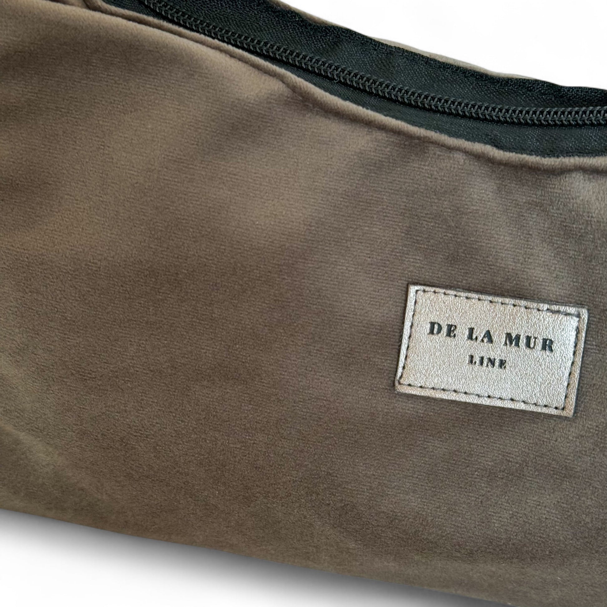 Deze kleine schoudertas uit de gelimiteerde Night Edition van de La Mur Line is een stijlvolle eyecatcher. Dit elegante tasje is uitgevoerd in een taupekleurige fluwelen stof.