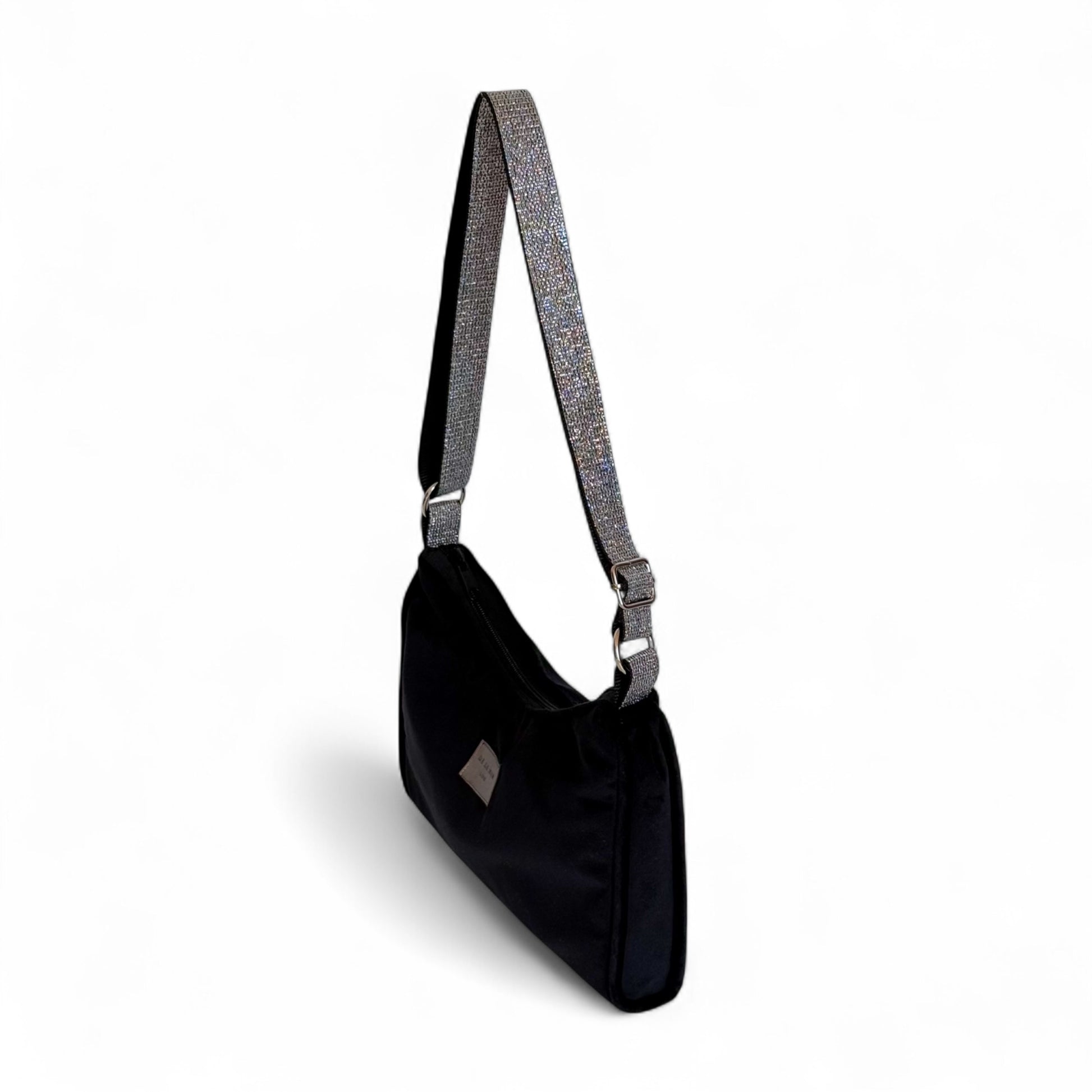 De lange, verstelbare schouderband van zwart katoen heeft aan één zijde een zilverkleurige lurex (glitter) voor een feestelijk accent. Je draagt de tas crossbody of stijlvol over de schouder - een chique finishing touch voor je outfit.