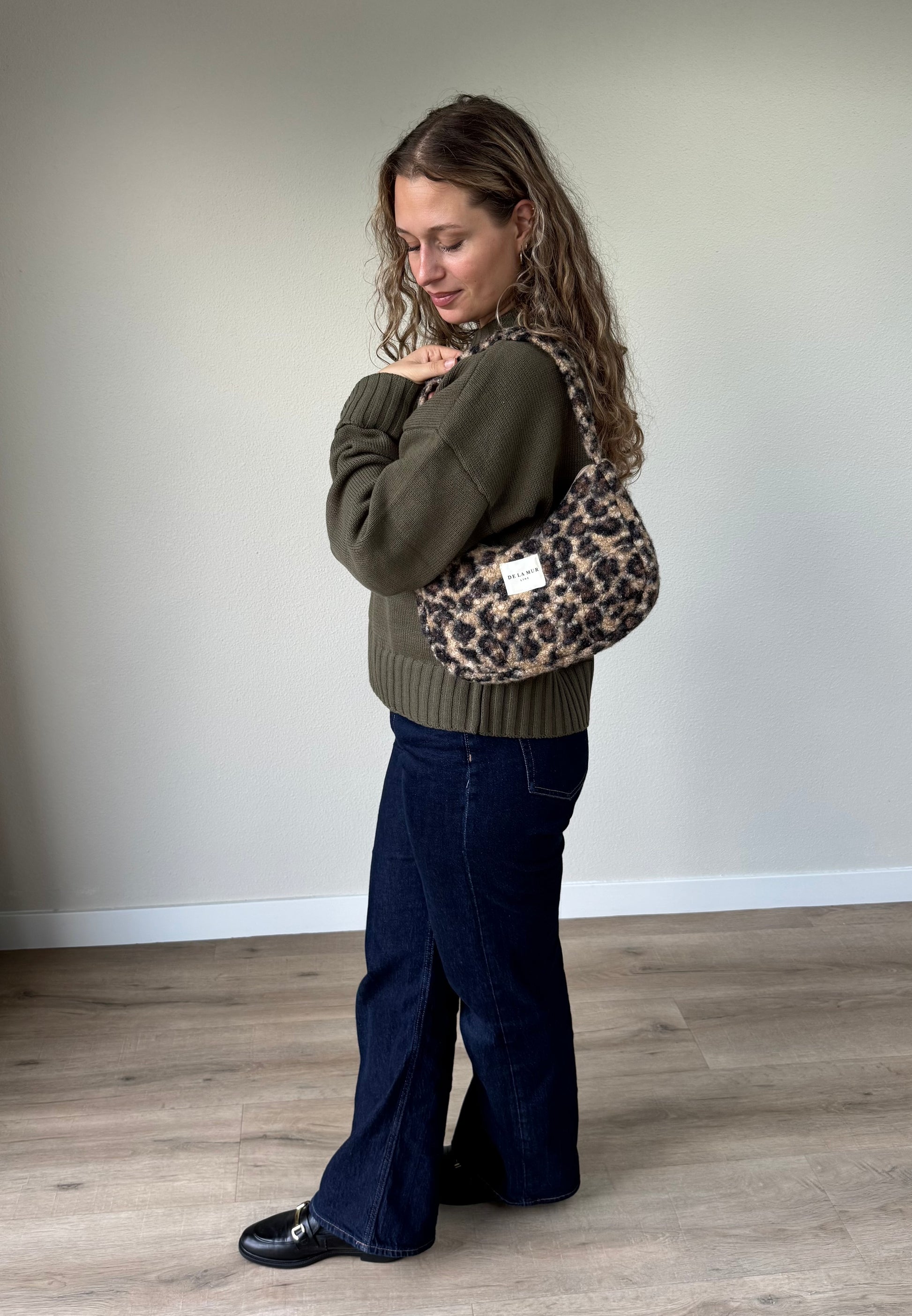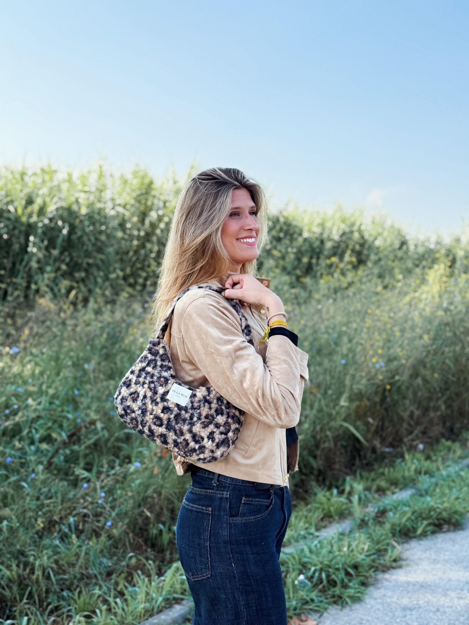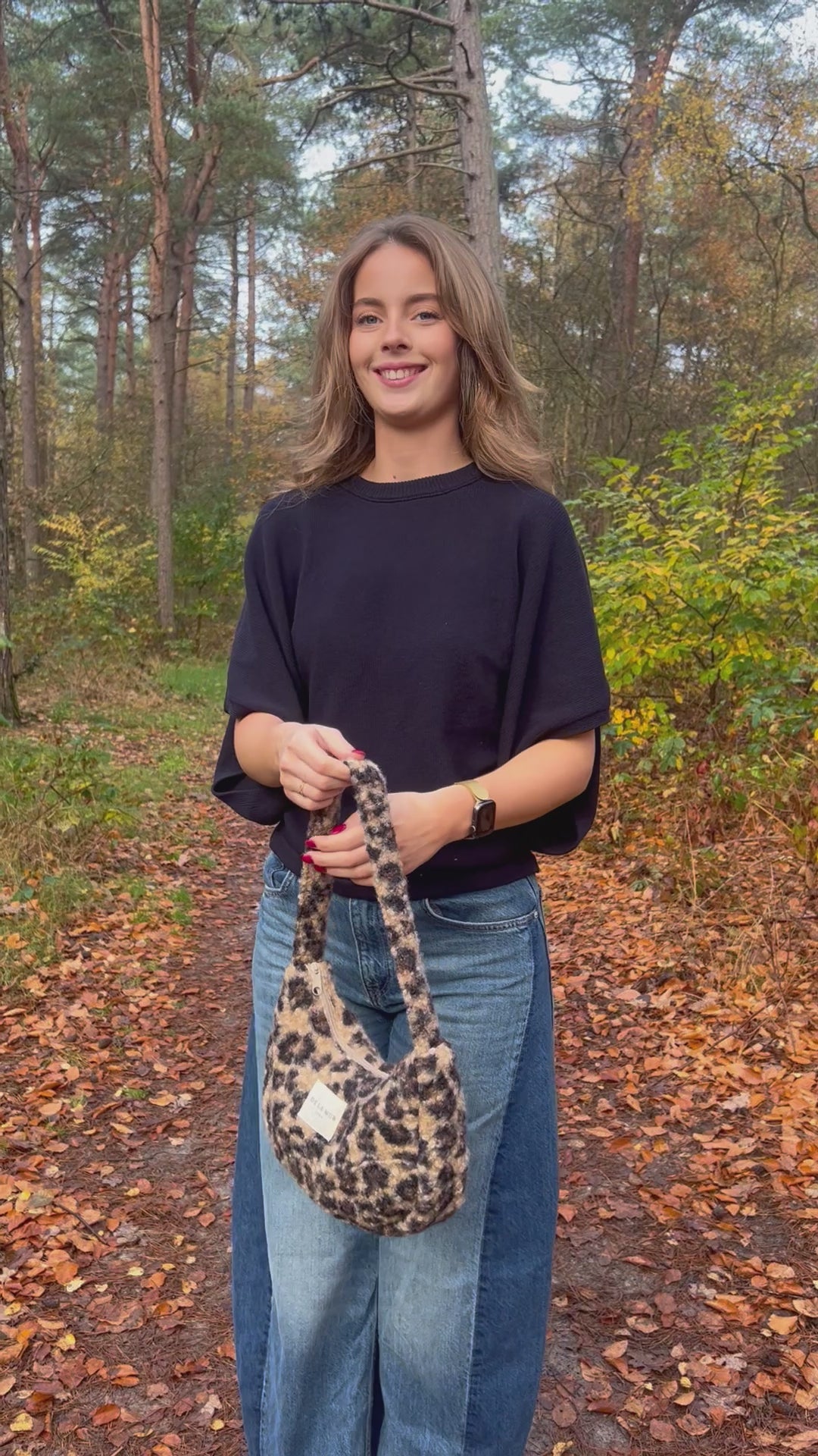 Deze kleine schoudertas van de La Mur Line is gemaakt van een dikke teddystof met een luipaardprint.