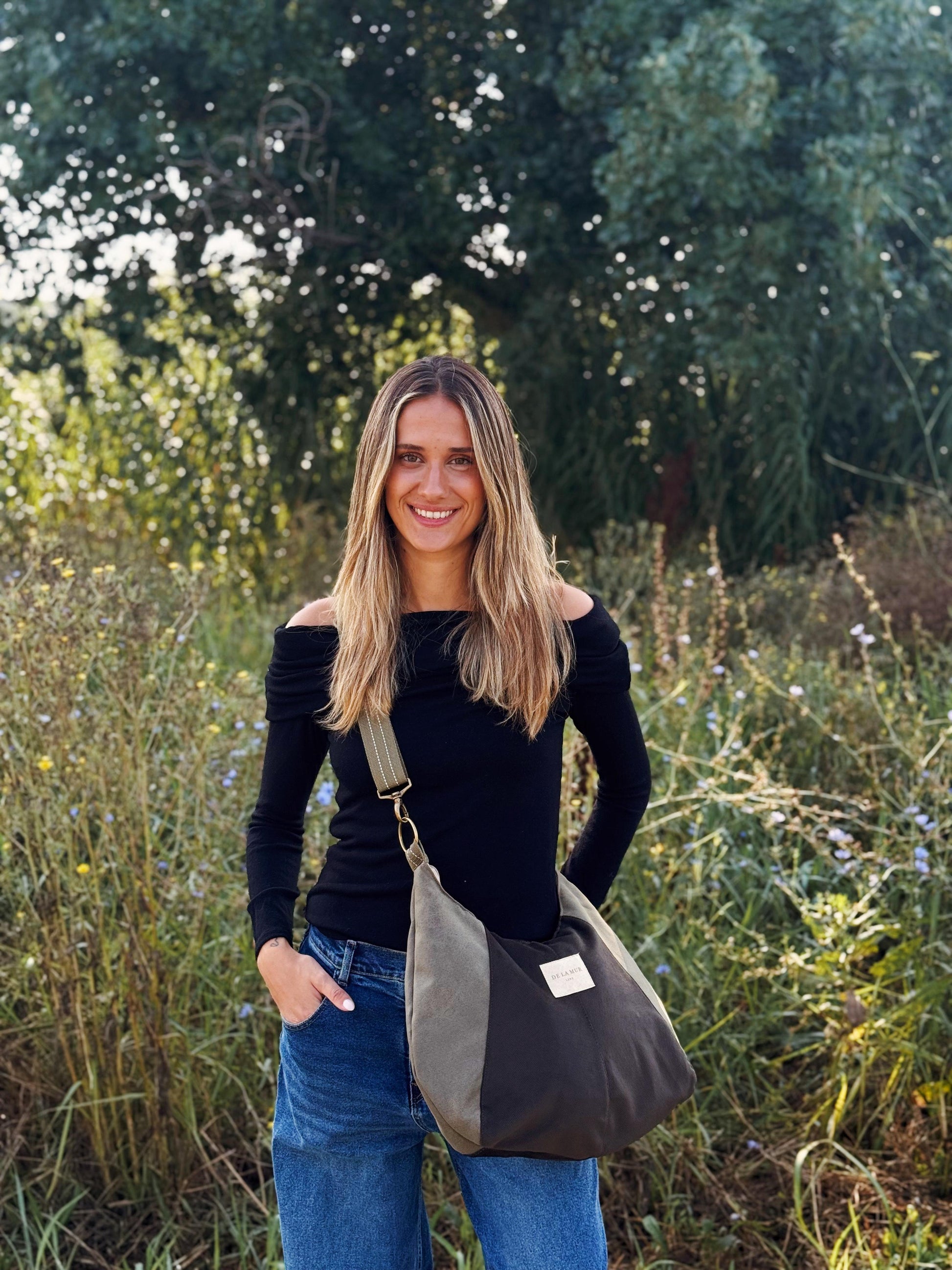 De tas heeft een lange, verstelbare schouderband van katoen in bijpassend kaki-groen. Je draagt de tas comfortabel crossbody of nonchalant over de schouder - ideaal voor zowel alledaagse uitstapjes als speciale gelegenheden.