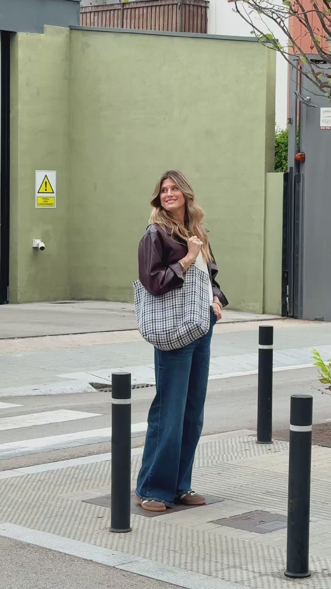 Deze grote shopper van De La Mur Line is uitgevoerd in een dikke jacquardstof met een ruitjespatroon in beige en zwarttinten.
