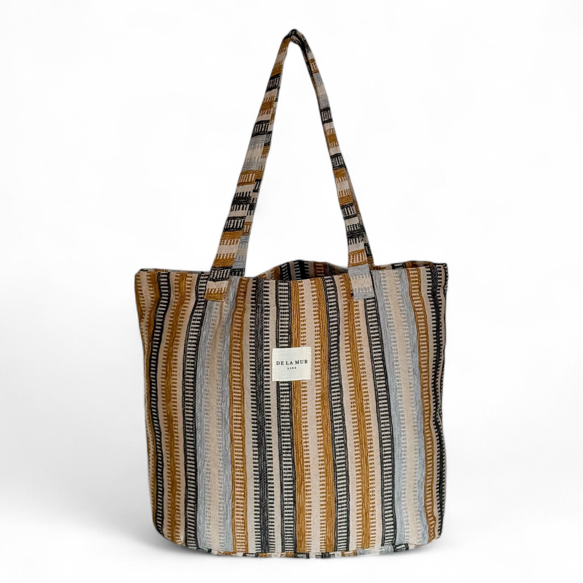 Deze grote shopper van De La Mur Line is uitgevoerd in een dikke jacquardstof met een streeppatroon in mosterdgeel, zwart, wit en grijs.