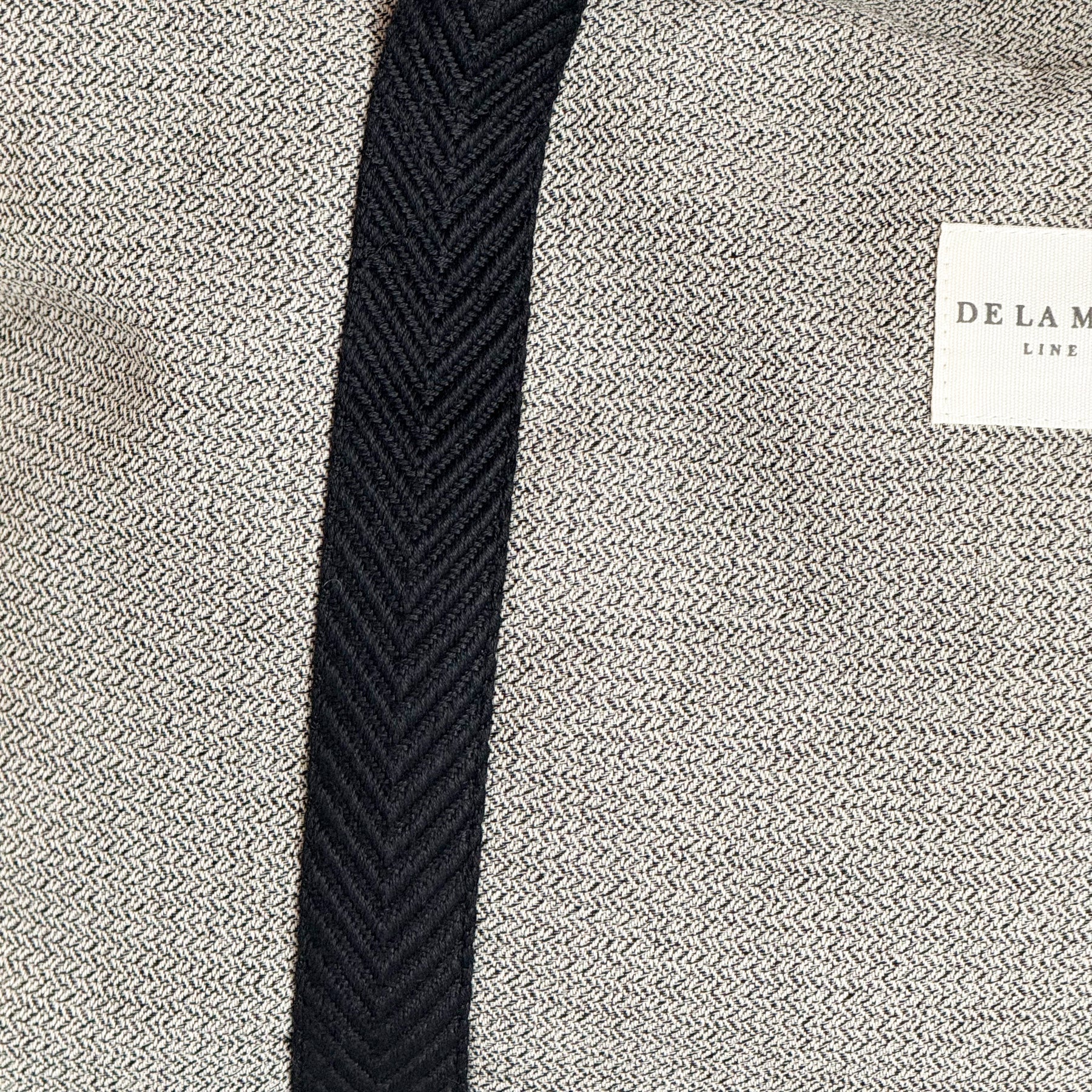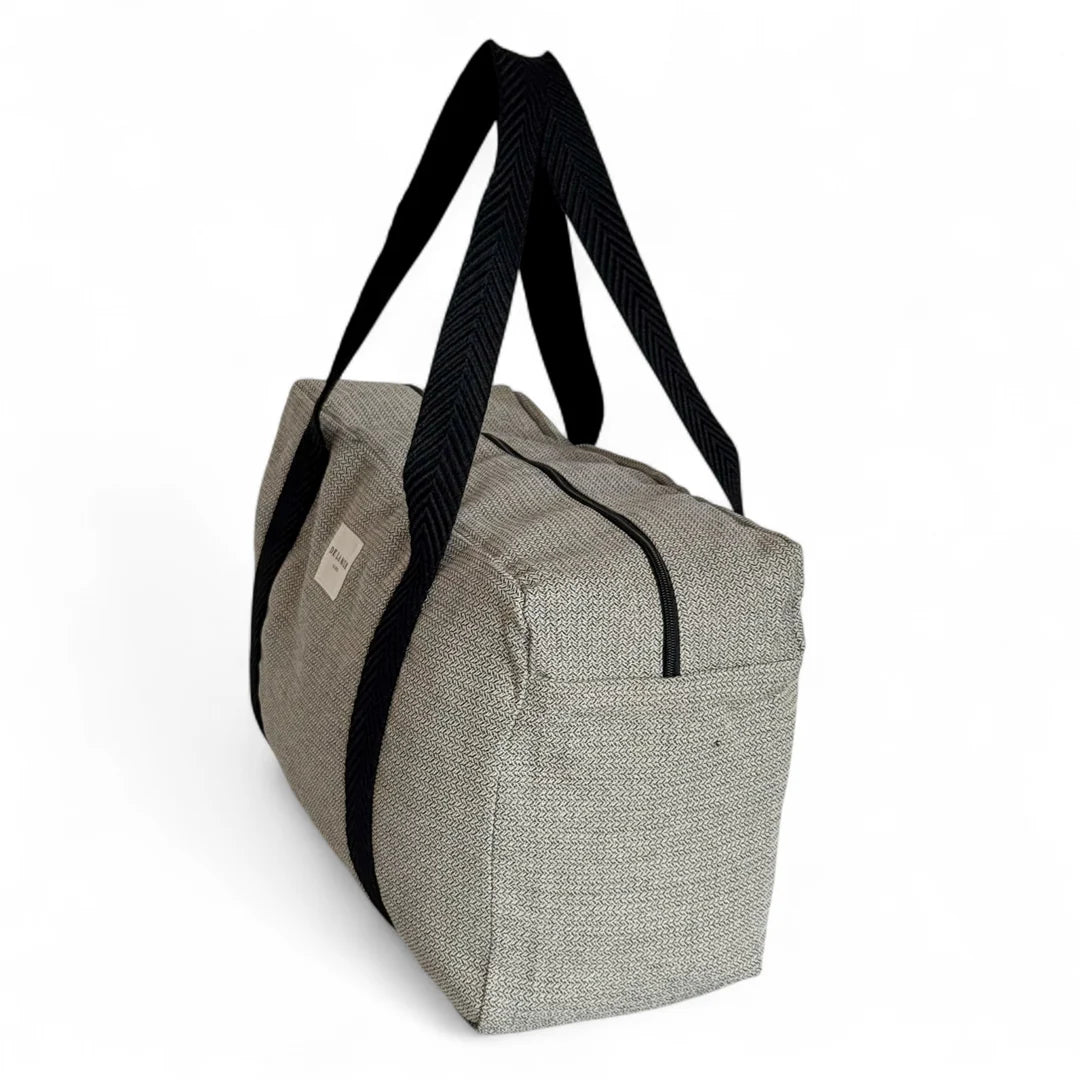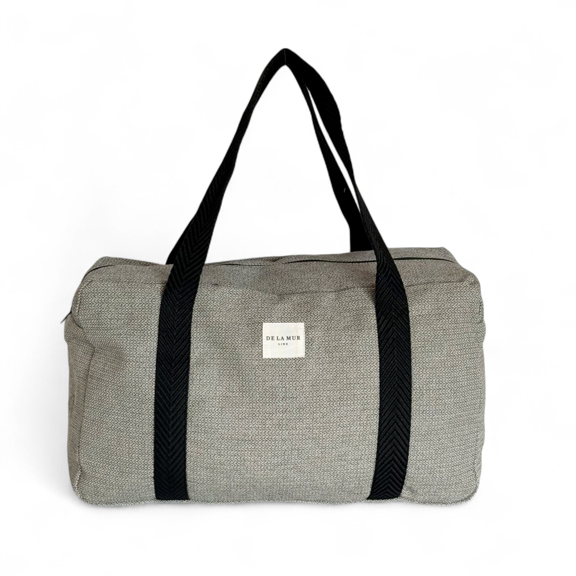 Deze stevige en ruime sporttas van de La Mur Line, ook wel duffeltas of duffle bag genoemd, is uitgevoerd in een dikke, effen grijze stof met visgraatpatroon.