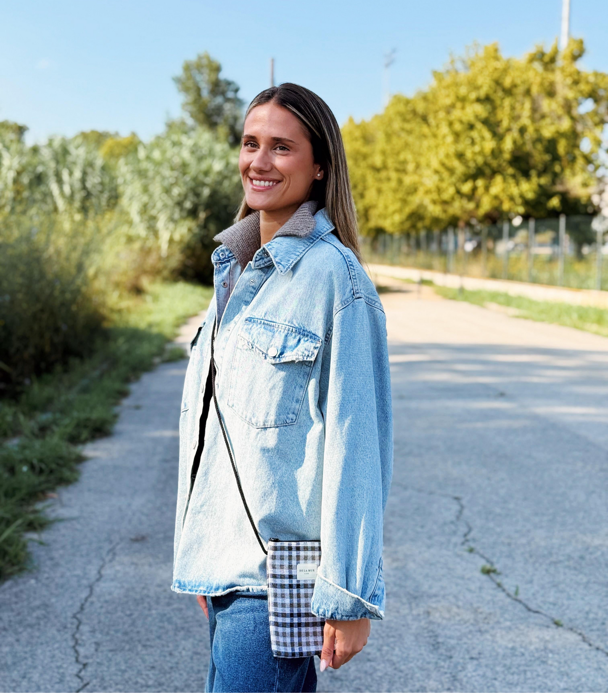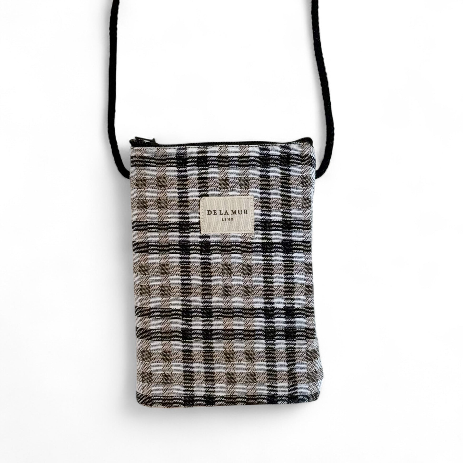 Dit leuke telefoontasje van de La Mur Line is uitgevoerd in een dikke jacquardstof met een ruitjespatroon in beige en zwarttinten.