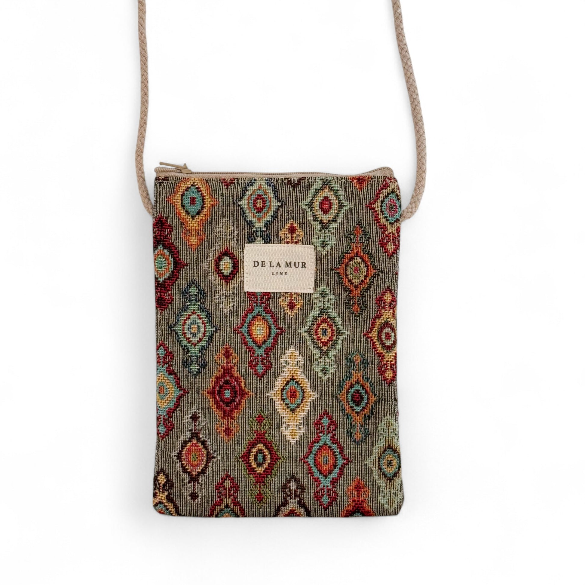 Dit leuke telefoontasje van de La Mur Line is uitgevoerd in een dikke jacquardstof met een ruitmotief in warme tinten zoals grijs, roest, donkergroen, oker en turquoise.