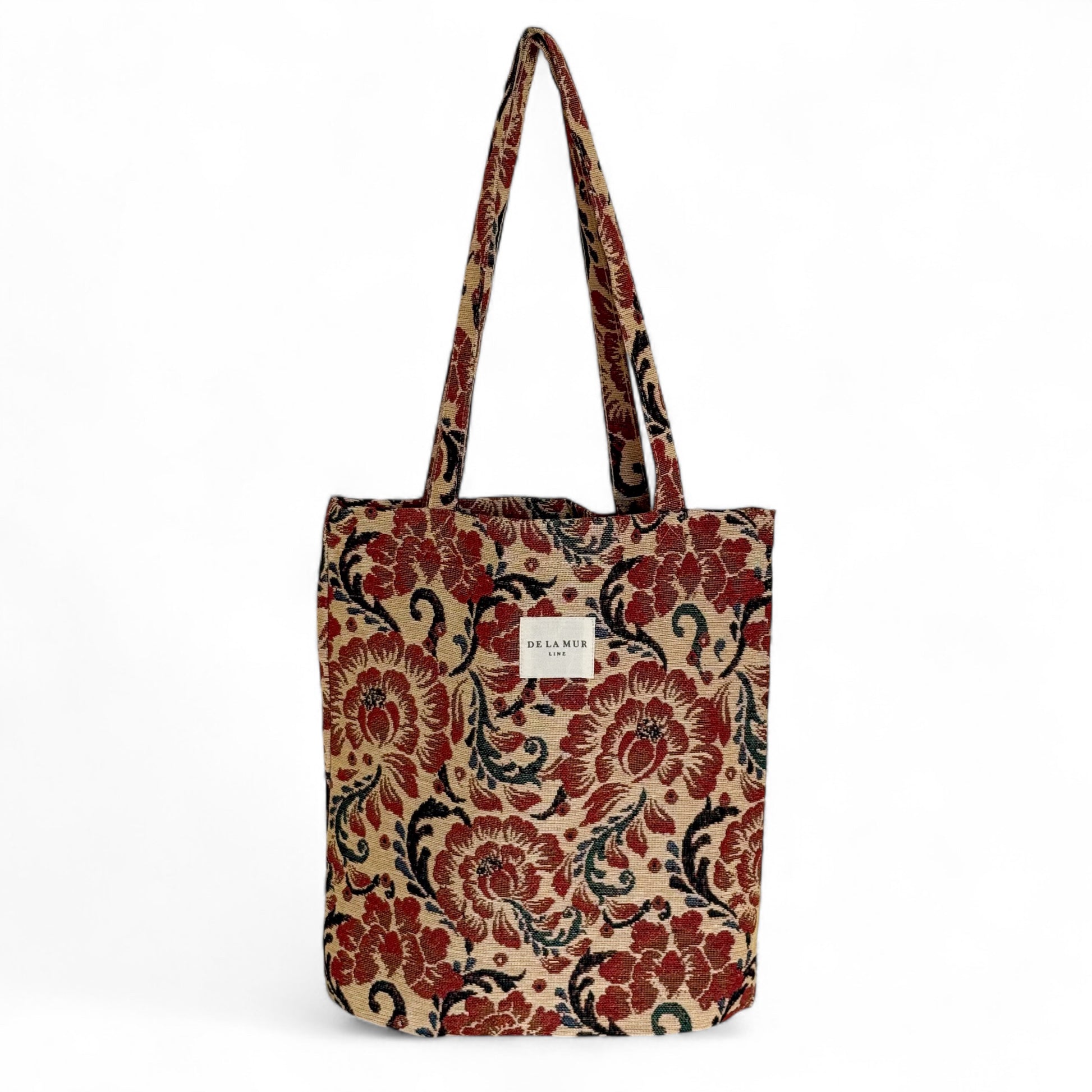 Deze shopper van de La Mur Line is uitgevoerd in een dikke jacquardstof met een warme, vintage bloemenprint in beige en roodtinten.
