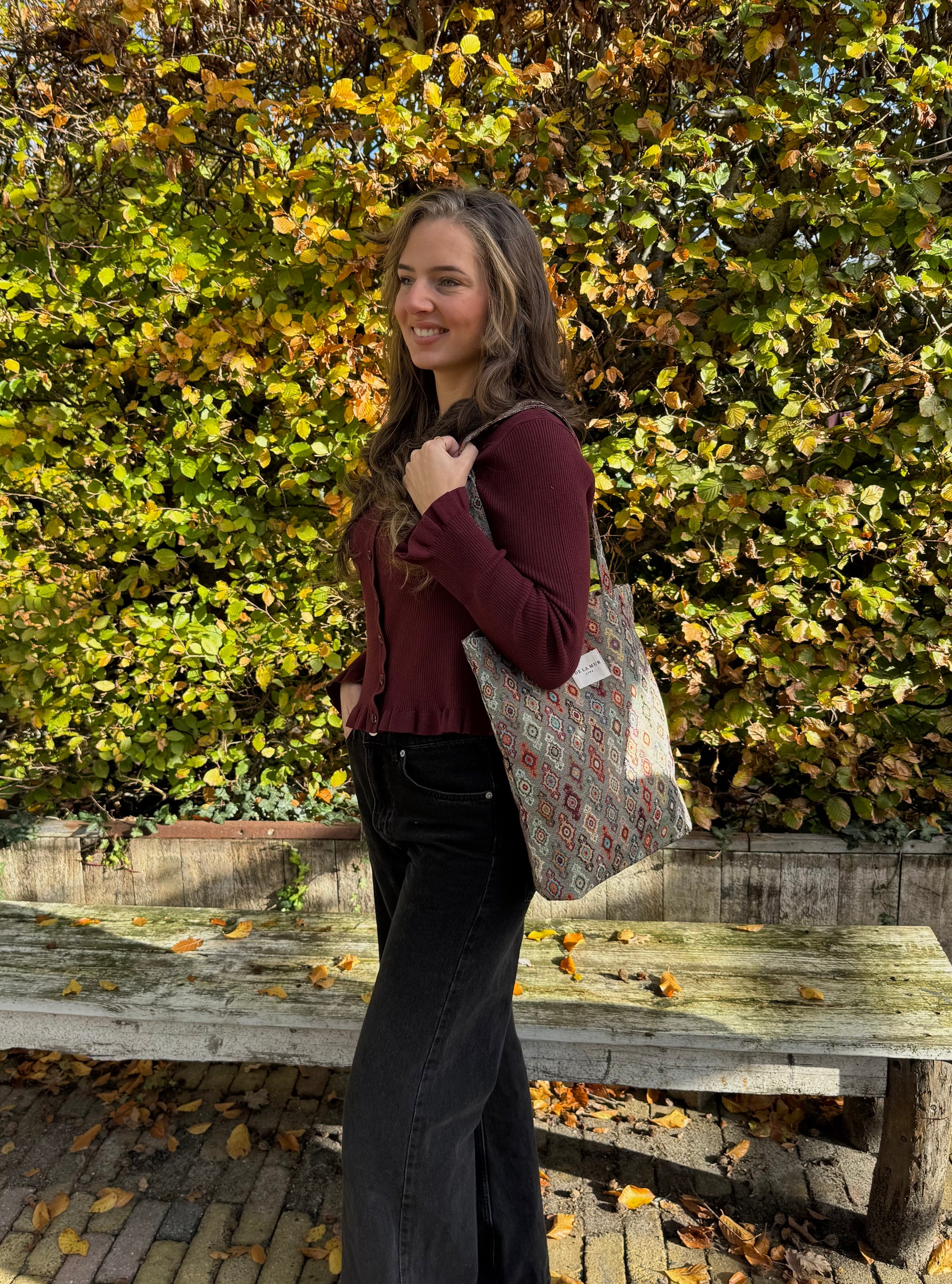 Deze shopper van de La Mur Line is uitgevoerd in een dikke jacquardstof met een ruitmotief in warme tinten zoals grijs, roest, donkergroen, oker en turquoise.