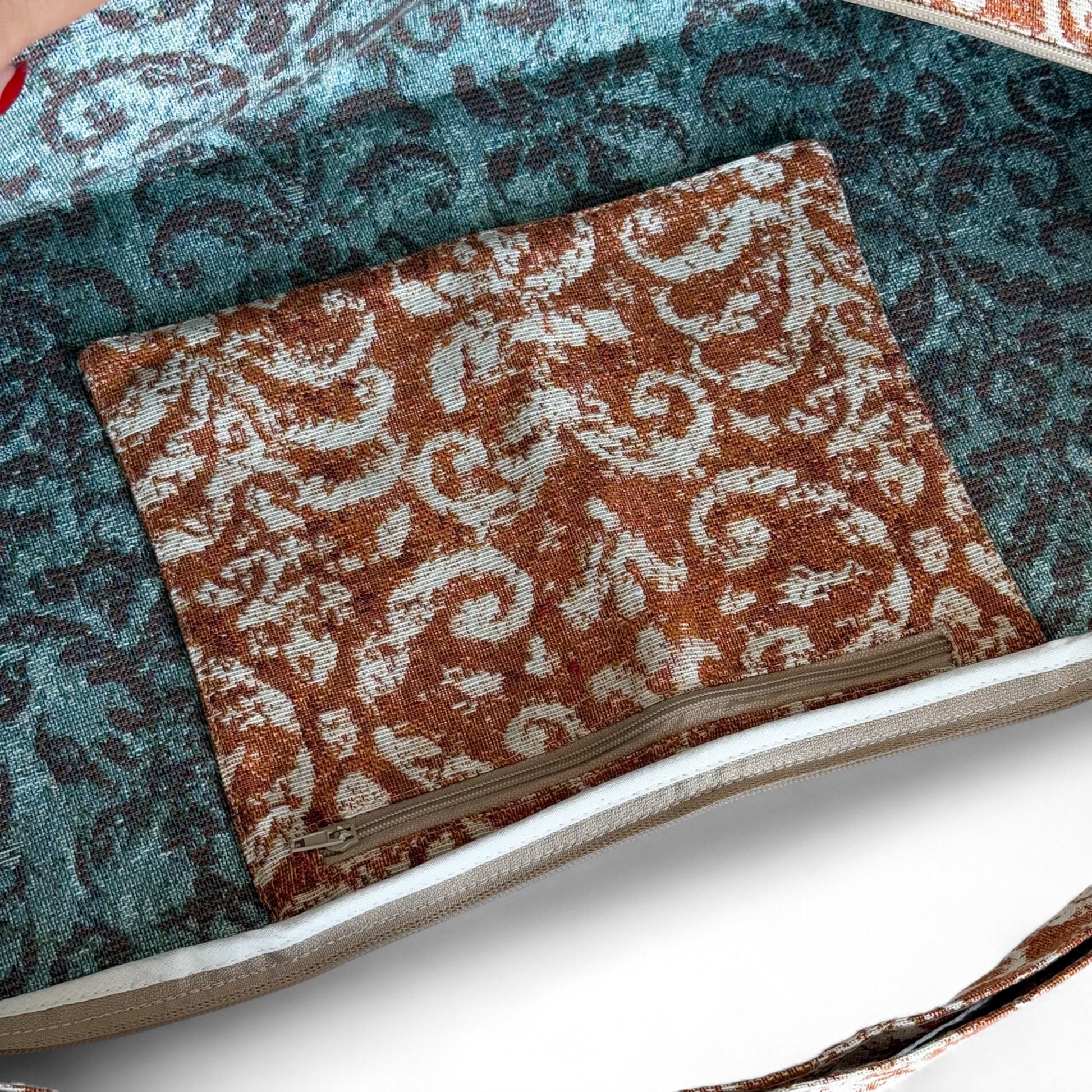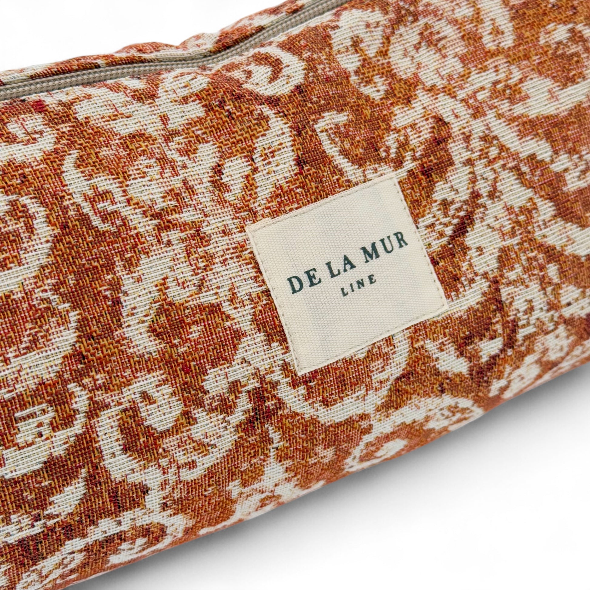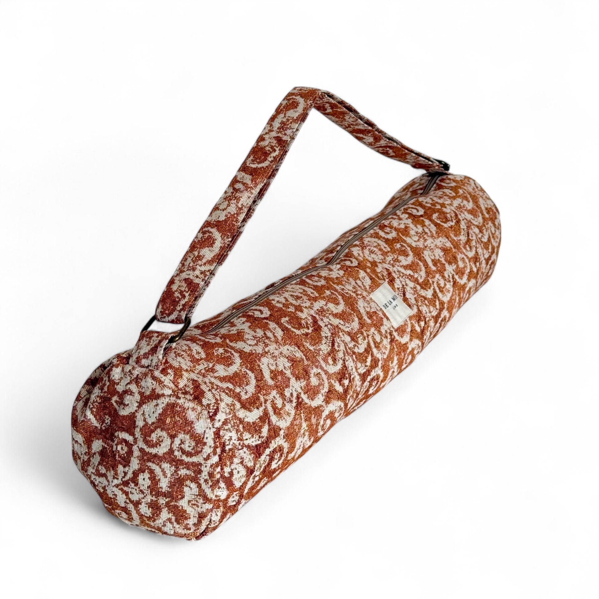 Deze yogamat tas van de La Mur Line is uitgevoerd in een dikke jacquardstof met een beige ornamentmotief op een roestbruine achtergrond. De structuur en kleurcontrasten geven de stof een klassieke en barokke uitstraling.
